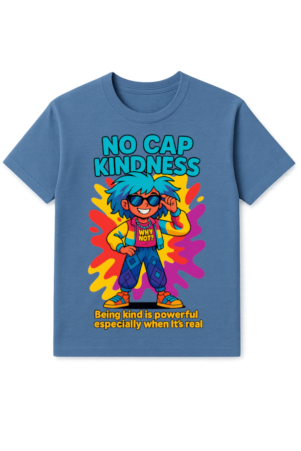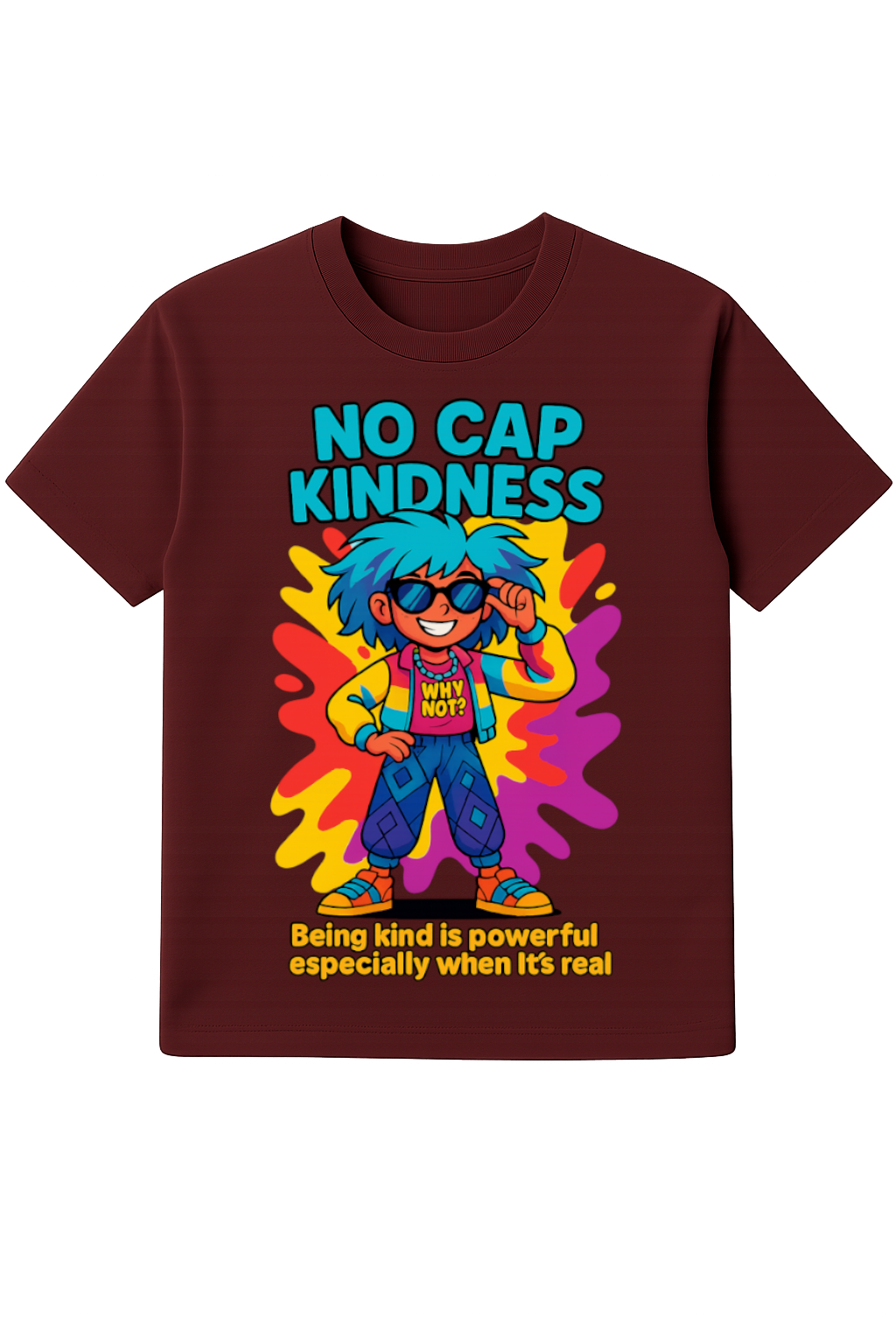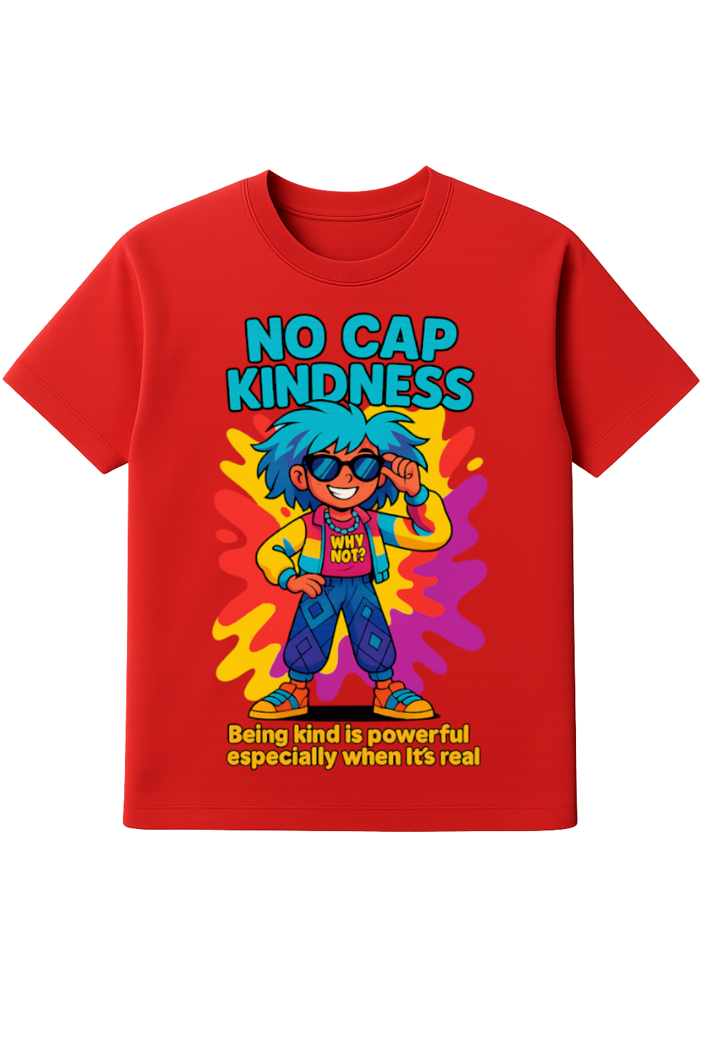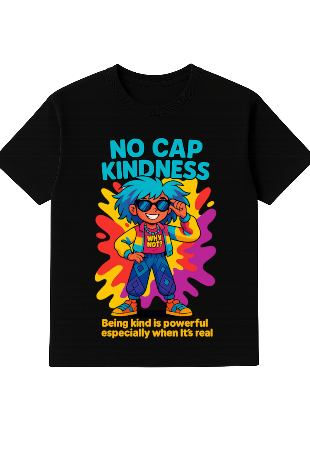 This tee flexes a “No Cap Kindness” motto with neon-splash vibes that others can’t resist. Rocking that “Why Not?” attitude and the reminder that real kindness is the ultimate flex, it’s the perfect drip for anyone keeping it 100.